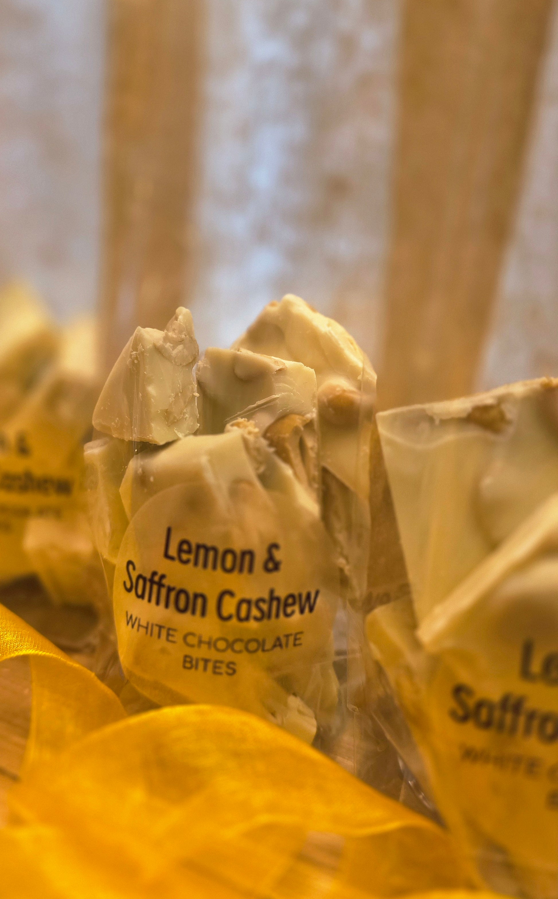 White chocolate chunks infused with vibrant lemon, Blackthorn sea salt and generously studded with golden saffron cashews.